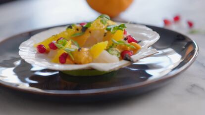 Emplata montando cada ingrediente encima de cada vieira en la media concha y termina con aceite de oliva virgen extra.