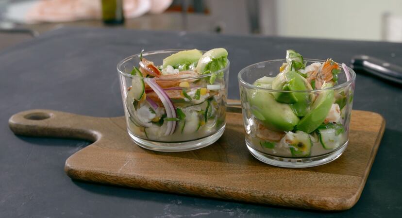 El ceviche es un plato popular en muchas regiones de América Latina, cada una con sus propias variaciones y tradiciones. Esta versión convierte ingredientes sencillos en un manjar único. La combinación de jugo de lima y maracuyá con maíz, cebolla roja y chile jalapeño crea una salsa vibrante que realza el sabor de los camarones.