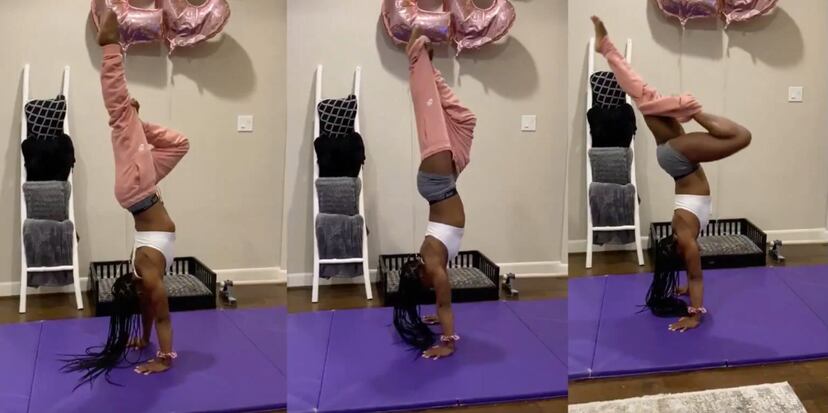 La gimnasta estadounidense ha subido un vídeo a sus redes quitándose un pantalón mientras hace el pino