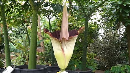 Este ejemplar es conocido como “la flor cadáver” por su olor a carne podrida y queso rancio, un aroma que atrae insectos polinizadores para que se encarguen del intercambio de polen necesario para su reproducción. Esta especie, originaria de las selvas tropicales de la isla de Sumatra (Indonesia), puede alcanzar los tres metros de altura y sus hojas llegan a medir hasta seis metros de largo. La flor de la familia araceae se puede encontrar en los jardines botánicos de otras ciudades como Basilea (Suiza), Berlín, Bonn y Göttingen (Alemania), Bogor (Indonesia), Nueva York (Estados Unidos) y Wageningen (Holanda).