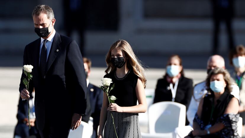 El Monarca se había quitado la mascarilla para pronunciar su discurso y, al volver a su sitio para guardar el minuto de silencio en memoria de las víctimas, ha olvidado volver a colocársela. Tras el recordatorio de su hija, el monarca ha reaccionado de forma cariñosa, le ha agradecido el aviso y se ha colocado la mascarilla negra que llevaba guardada en el bolsillo interior de su americana.