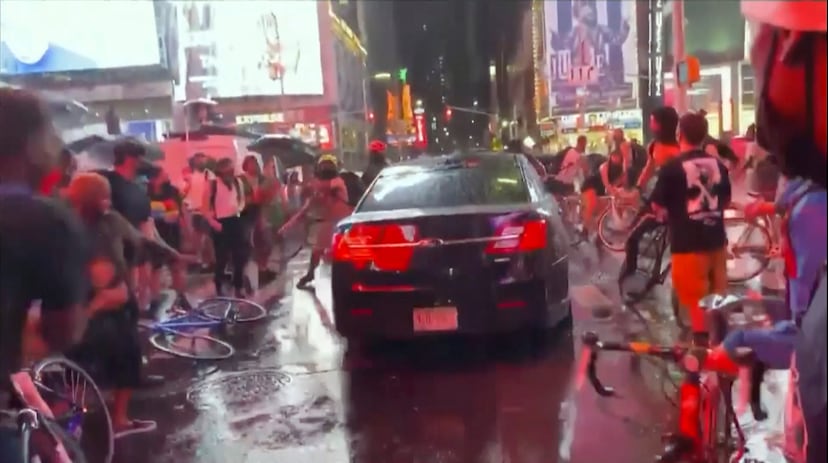A pesar de la lluvia, cientos de personas salieron anoche a la archiconocida intersección de Times Square, en Nueva York, para protestar contra la violencia policial en Estados Unidos, tras hacerse público ese mismo día el caso de la muerte en marzo del afroamericano Daniel Prude a manos de la policía. Mientras un grupo de personas del movimiento Black Lives Matter detenían el tráfico de coches con sus bicicletas, un sedán negro de la marca Ford aceleró bruscamente, arrollando a varias personas que no pudieron evitar el impacto. Por fortuna, nadie resultó herido de gravedad. El departamento de Policía de Nueva York ha tenido que aclarar en sus redes sociales que no se trata de un coche policial, y que están tratando de hallar al conductor del vehículo.