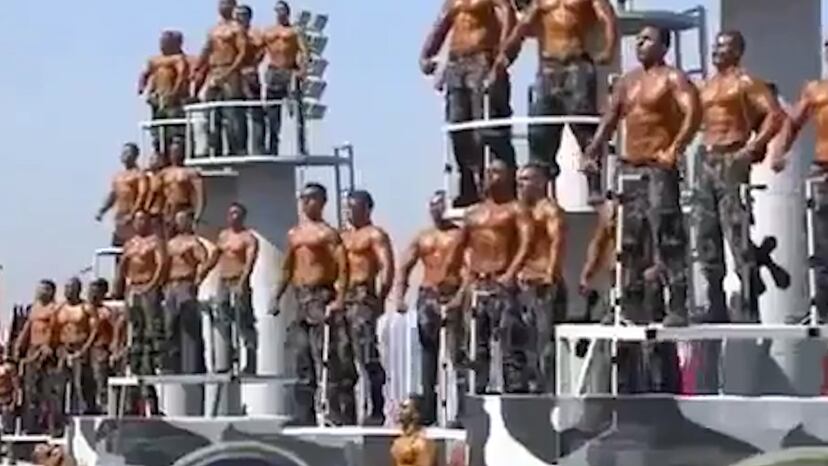 El momento que más sensación han generado es cuando aparecen decenas de futuros policías con el pecho al aire y los brazos dispuestos en forma de croissant clásico montados en lanchas rápidas, camiones, blindados o aparatosas estructuras a remolque en las que no se acaba de entender si exhiben a los vehículos o se exhiben a ellos mismos.