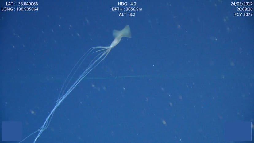 de aleta grande que nadaban juntos en aguas australianas. El avistamiento se ha producido en las profundidades del océano, a varios kilómetros por debajo de la superficie de la Gran Bahía Australiana, lo que ha supuesto el primer registro de este tipo de animales en el país. “Los avistamientos de calamar de aleta grande son muy raros. Estos son los primeros registros en aguas australianas, que se suman a solo una docena de avistamientos confirmados en todo el mundo", explica Deborah Osterhage, una de las científicas marinas del equipo.