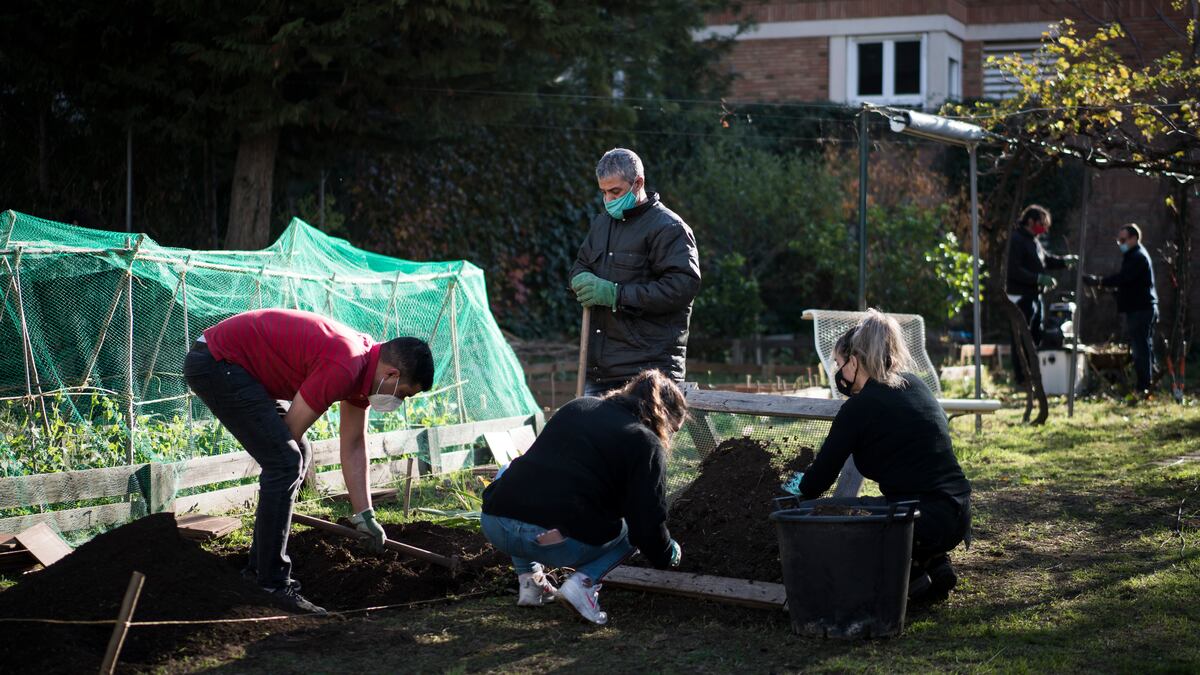 Usuarios del Centro de Atención y Seguimiento a las drogodependencias de Sarrià (Barcelona) trabajan en una plantación urbana para curar sus adicciones