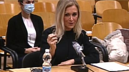 La expresidenta de la Comunidad de Madrid, Cristina Cifuentes, está acusada de inducir a la falsificación del acta del trabajo final de máster (TFM) que cursó en la Universidad Rey Juan Carlos (URJC). El llamado caso Máster, por el que la Fiscalía pide tres años y tres meses de cárcel para la política, ha celebrado su cuarta y penúltima sesión este viernes, con tres acusadas sentadas en el banquillo. María Teresa Feito ―exasesora de la Consejería de Educación madrileña y funcionaria de la Universidad Rey Juan Carlos―, se enfrenta a la misma pena; y Cecilia Rosado, profesora del máster e integrante del tribunal que supuestamente examinó a Cifuentes, se enfrenta a 21 meses porque reconoció que falsificó el acta y colaboró con la justicia. El otro acusado en el juicio era el catedrático Enrique Álvarez Conde, fallecido en 2019 y calificado como “cerebro” de la trama por la juez que llevó a cabo la investigación. Este vídeo compara las declaraciones hechas antes y después del juicio, que denotan las diferencias del relato de lo ocurrido según quién lo narra, y también cómo ha cambiado a lo largo del tiempo la defensa de la exdirigente del Partido Popular. El próximo viernes se celebrará la fase de informes finales, en la que las partes jugarán su última baza.