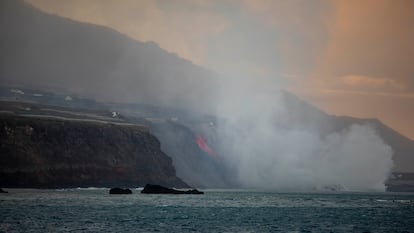 Tras tocar el mar por primera vez alrededor de las 11 de la noche de este martes, la colada de lava proveniente del volcán de La Palma se precipitó por un acantilado de 100 metros y el contacto creó una nube tóxica que el viento ha proyectado al interior de la isla. En las últimas horas el avance de la lava ha sido constante y sus efectos ya se podían observar en el amanecer de la isla.