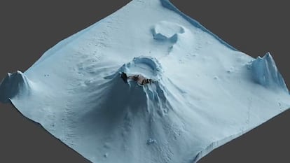 Un modelado 3D digital muestra la caldera volcánica de cinco kilómetros de diámetro que se encuentra en el sur del Pacífico