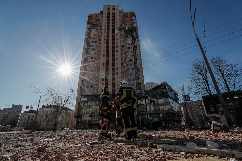 El impacto de un misil ruso contra un edificio de apartamentos en el oeste de Kiev es la huella más visible de cómo la batalla se recrudece en la capital. Al menos 35 personas han resultado heridas la madrugada del sábado, incluyendo dos niños, según el balance de toda la ciudad hecha por su alcalde, Vitali Klistchko. “Una brutalidad más de los ocupantes rusos que, de ninguna forma, se podrá ocultar al mundo y a los rusos”, escribió Antón Gueráschenko, asesor del Ministerio del Interior. El edificio está situado a varios kilómetros del centro, en la calle Lobanovski, en honor al legendario entrenador de fútbol ucranio y seleccionador soviético.