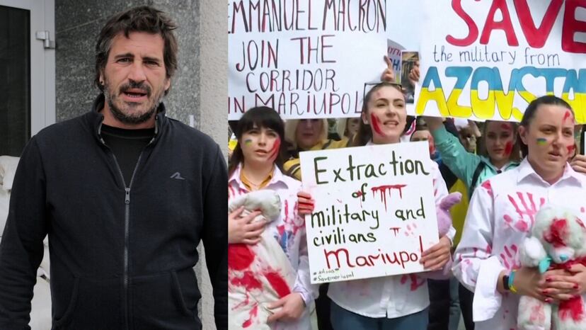 Un grupo de mujeres, entre las que había parejas de combatientes ucranios atrapados en la acería de Azovstal, se concentraron el miércoles en Kiev para pedir la evacuación de los soldados y los civiles que están refugiados en la fábrica. En la capital está uno de los enviados especiales de EL PAÍS a Ucrania, Jacobo García, que en este vídeo relata cuál es la situación en el último bastión ucranio en Mariupol.
