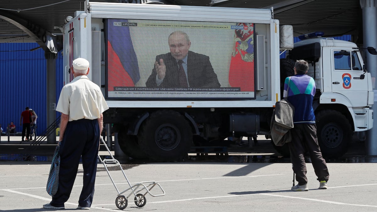 Un camión-pantalla situado en un punto de distribución de ayuda humanitaria en Mariupol muestra la señal de la televisión estatal rusa. Foto: ALEXANDER ERMOCHENKO (REUTERS) | Vídeo: REUTERS