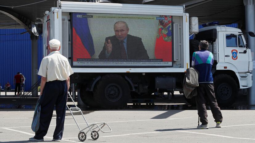 La toma de Mariupol por parte de las tropas rusas también se juega en el campo de la propaganda. Tras la rendición del Ejército ucranio que resistía desde la acería Azovstal el pasado 17 de mayo, la ciudad pertenece al Kremlin. En el vídeo que acompaña a esta noticia se muestra como la propaganda y emblemas prorrusos son los protagonistas en la nueva rutina de la ciudad. Las imágenes pertenecen al pasado 30 de mayo, cuando una gran pantalla, instalada por un grupo de funcionarios, mostraba imágenes de la televisión estatal de Rusia bajo la atenta mirada de los viandantes, en una estación de autobuses abandonada. Mientras, los vecinos recogían alimentos de primera necesidad distribuidos en cajas marcadas con la ‘Z’, la letra escogida como símbolo de adhesión a la invasión rusa.