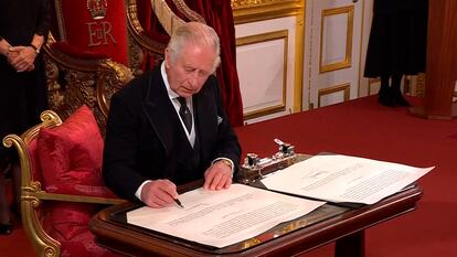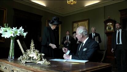Le sucedió el sábado durante la firma de su proclamación como Rey en el Palacio de Saint James de Londres. Ha vuelto a pasarle este martes en Irlanda del Norte. Carlos III solo tenía que firmar el documento, pero la misión resulta más que complicada por la actitud de la pluma. El sábado ocupaban demasiado espacio en la mesa. Este martes el problema ha sido la tinta, que no se ha contenido en su recipiente y ha empezado a salir de forma discreta por las ranuras del artefacto. Ha sido la reina consorte la que ha advertido a su marido del peligro. El Rey ha reaccionado con vehemencia contra la “maldita” tinta. Ha sido el remate a una ceremonia, aparentemente simple, que ya ha comenzado mal. El nuevo rey se ha equivocado de fecha al firmar, así que ha tenido que corregir sobre la marcha. Todo esto ha sucedido en el castillo de Hillsborough. En el vídeo que encabeza la noticia se puede ver la secuencia completa. Al pie de este texto está incluido el resumen de la ceremonia del sábado, en la que Carlos III tuvo su primer “encontronazo” con los útiles de la escritura