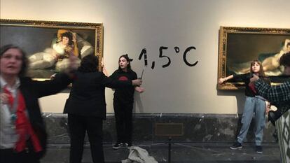 Dos activistas de la asociación ambiental Futuro Vegetal pegaron sus manos este sábado a los marcos de los cuadros de La maja desnuda y La maja vestida de Francisco de Goya expuestos en el Museo Nacional del Prado, en Madrid, en señal de protesta por la emergencia climática. En el muro donde están colgadas dichas pinturas, concretamente en el espacio que las separa, escribieron el mensaje “+1,5º” para “alertar sobre la subida de temperatura mundial que provocará un clima inestable y graves consecuencias en todo el planeta”. La propia organización compartió en sus redes sociales las imágenes del asalto, que puede ver en el vídeo que acompaña a esta noticia.