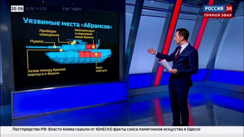 El mismo canal de televisión transmitió otro programa titulado Battered Abrams, que mostraba imágenes de los tanques fabricados en Estados Unidos que serán enviados a Kiev. En el programa explican los puntos débiles de Abrams asegurando que “su blidaje es débil en los laterales y en espacio entre el casco y la torreta”.