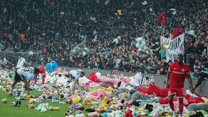Aficionados lanzan juguetes al campo durante el partido en Estambul, Turquía, el domingo 26 de febrero de 2023.Foto: AP Photo | Vídeo: EPV