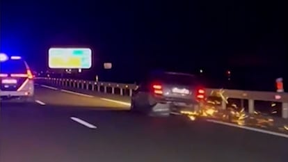 La Guardia Civil ha detenido al conductor de un vehículo que circulaba sin rueda delantera y sin uno de los neumáticos traseros en la provincia de Valladolid. El varón circuló varios kilómetros mientras chocaba reiteradamente contra la valla metálica lateral en el kilómetro 126 de la A-62 en sentido Burgos. Los hechos ocurrieron en la madrugada del 19 de febrero, cuando una patrulla de la Guardia Civil detectó a un vehículo que daba bandazos y producía una gran estela de chispas contra el asfalto. En el vídeo que acompaña esta noticia se ve cómo dos vehículos de la Guardia Civil escoltan al conductor hasta que logran detenerlo.