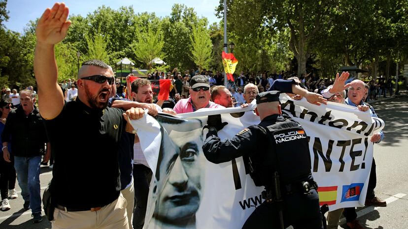 Como puede verse en el vídeo que acompaña a esta noticia, los restos del fundador de Falange, José Antonio Primo de Rivera, han sido exhumados este lunes de su tumba en la basílica del Valle de Cuelgamuros, antes llamado Valle de los Caídos, y han llegado hasta el cementerio de San Isidro de Madrid, donde se han producido altercados entre falangistas y policías. Los simpatizantes han tratado de entrar por la fuerza al cementerio, lo que ha provocado un forcejeo con los agentes de policía, que ha acabado con tres detenidos y cinco personas identificadas, según fuentes policiales. Cerca de 200 simpatizantes han entonado el Cara al sol y realizado saludos romanos durante la entrada de los restos de José Antonio Primo de Rivera al cementerio, donde también se han escuchado gritos de “José Antonio Primo de Rivera. ¡Presente!” y “¡Arriba España!”.