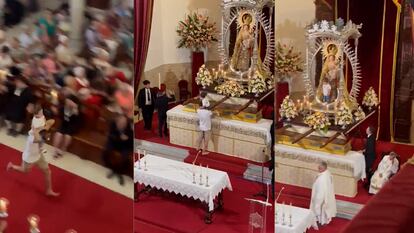 Un hombre irrumpe corriendo con un niño a hombros durante una misa en el Santuario del Carmen de Los Realejos (Tenerife) para subir al pequeño junto a la imagen de la virgen. Tras dejar al menor sobre el paso religioso, el protagonista se baja del altar, dejando solo al niño. El suceso ocurrió el pasado domingo durante una misa en el municipio tinerfeño y el vídeo -que acompaña a esta noticia- se ha hecho viral en redes sociales, donde numerosos usuarios han criticado la conducta de este hombre por “poner en peligro” al pequeño. Varios testigos del suceso han asegurado a EL PAÍS que no se trata de ninguna tradición local, y que desconocen los motivos que llevaron al protagonista a realizar esta peripecia, siendo un hecho “impactante para todos”. Desde el Ayuntamiento y la parroquia de la localidad no han querido pronunciarse sobre estos hechos.