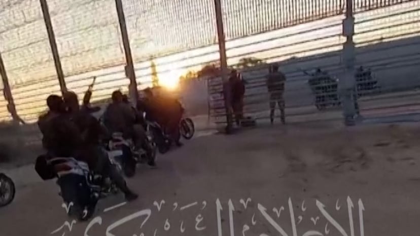 Hamás ha difundido este sábado unas imágenes, recogidas por la agencia Reuters, que muestran el momento en el que al menos una decena de hombres armados penetraban a una base militar israelí cerca de la frontera con la franja de Gaza. A pie o en vehículos, los hombres han entrado tras manipular el cerco de seguridad, como se pueden ver en el vídeo que acompaña a esta noticia. Tras la incursión por milicianos de Hamás, grupos de palestinos también han destruido con excavadoras partes de la valla que separa ambos territorios y cruzado a territorio israelí.