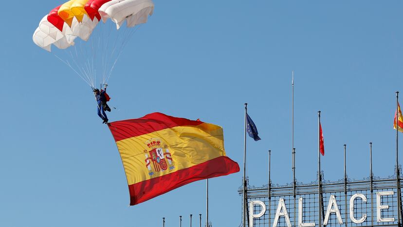 Vídeo | Una paracaidista se convierte en la primera mujer en saltar con la bandera de España en un desfile del 12 de octubre