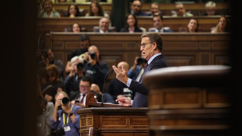 El líder del Partido Popular, Alberto Núñez Feijóo (c), interviene en el primer día del debate de investidura del presidente del Gobierno en funciones, Pedro Sánchez, este miércoles en el Congreso de los Diputados en Madrid. Foto: CLAUDIO ÁLVAREZ | Vídeo: EPV