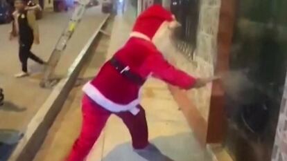 Un agente disfrazado de Papá Noel ha participado en un operativo policial contra la venta de drogas en la ciudad peruana de Huaral, al norte de la capital, Lima. En el vídeo que acompaña a esta noticia, se puede ver cómo el agente encubierto echa una puerta abajo haciendo uso de un martillo y posteriormente participa en la detención de dos personas.