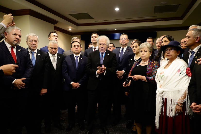 Luis Almagro, secretario general de la OEA, ha leído el texto acompañado por los españoles Albares y Borrell, entre otros