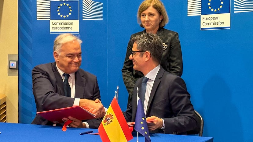 El ministro de Justicia, Félix Bolaños, negociador por el PSOE, y el eurodiputado electo Esteban González Pons, negociador por el PP, han sellado este martes en Bruselas el acuerdo para renovar el Consejo General del Poder Judicial (CGPJ) tras más cinco años de bloqueo. Los líderes políticos han comparecido por separado tras haber firmado el documento tutelados por la vicepresidenta de la Comisión Europea, Věra Jourová. El primero en explicar el pacto ante los medios ha sido González Pons. “Aunque parezca mentira, las buenas noticias todavía existen y las esperanzas, también, y los políticos somos capaces de hacer cosas como esta”, ha afirmado el líder popular y ha puesto en valor que el CGPJ es más independiente de lo que era ayer, “alejado de la influencia de los políticos”. Posteriormente, Bolaños ha explicado que el PSOE y el PP han acordado presentar una proposición de ley que “refuerce la independencia del Poder Judicial”, que tendrá que ser aprobada después por el Congreso.