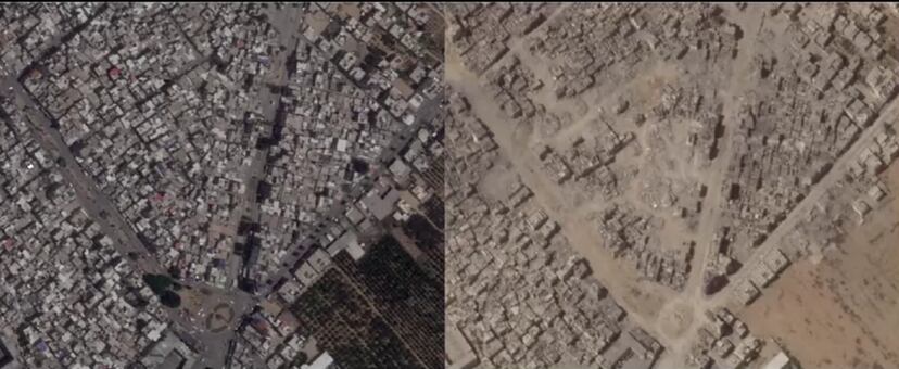 Varias imágenes de satélite de los campamentos de Rafah y Jan Yunis exhiben la destrucción de la guerra en Gaza. Unas se tomaron antes del 7 de octubre de 2023 y otras un año después. La comparativa visual, incluida en el vídeo que encabeza esta noticia, revela las huellas del conflicto, con 163.000 edificios dañados o arrasados, según datos de la ONU, siendo un tercio edificios altos. Sobre el terreno, los escombros se amontonan por encima de los peatones y los carros tirados por burros en los polvorientos y estrechos caminos que antaño fueron transitadas carreteras. La ONU calcula que hay más de 42 millones de toneladas de escombros. Esto es 14 veces la cantidad de escombros acumulados en Gaza entre 2008 y el comienzo de la guerra hace un año.