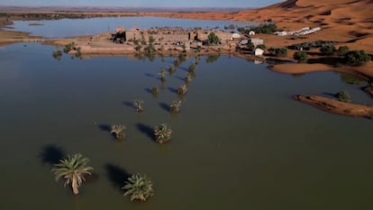 Una oleada de lluvias ha creado lagunas entre las dunas en Merzouga, en el sureste de Marruecos