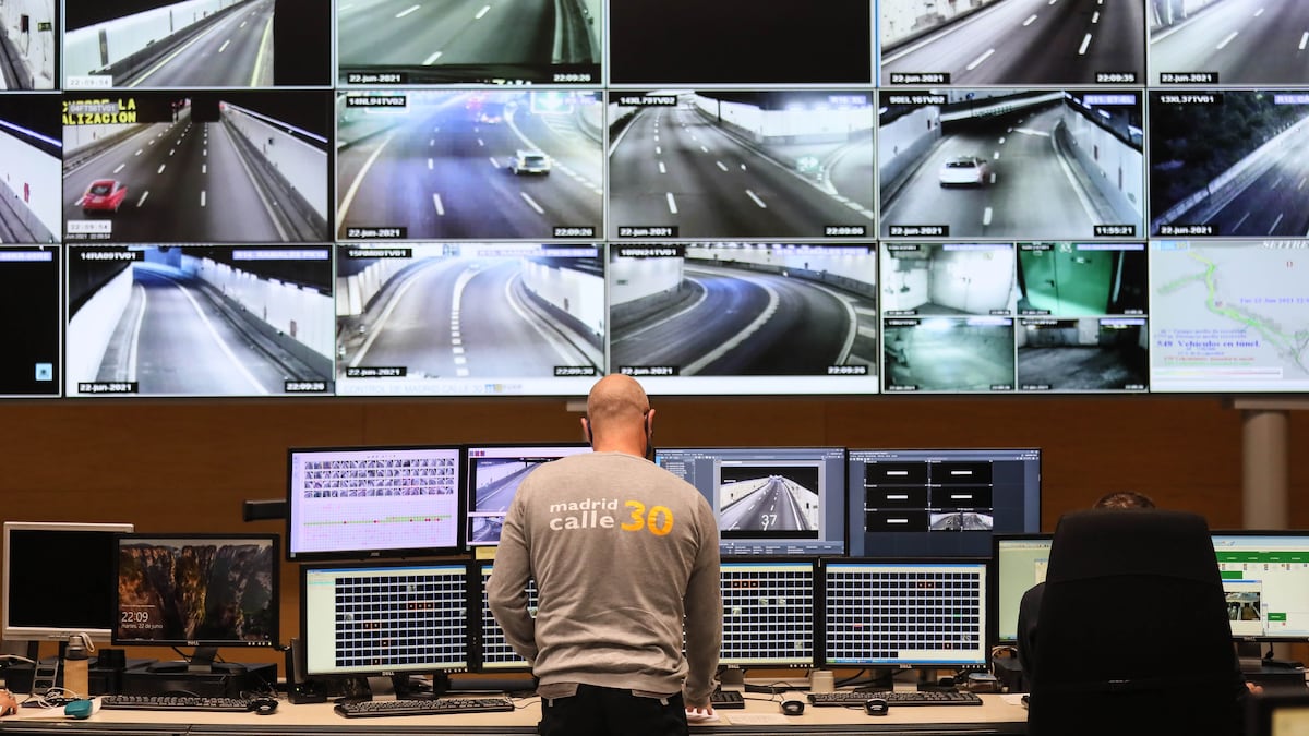 El centro de control de la M-30 de Madrid es un búnker con acceso directo a los túneles de la autovía. Una sala desde la que 24 operadores velan por la seguridad y el buen funcionamiento de la primera circunvalación de España, que comenzó a construirse hace ahora medio siglo. Pendientes de 1.800 cámaras, estos técnicos ejercen como un Gran Hermano que escudriña el subsuelo en tiempo real. Sus ojos son 18 pantallas de alta definición que muestran la vida subterránea del trazado y alertan ante cualquier incidencia. El oído está en las estaciones con fibra óptica, que registran y transmiten información como la densidad del tráfico. La autovía también respira, y lo hace a través de unas enormes turbinas que recogen el aire contaminado y lo filtran antes de devolverlo limpio a la atmósfera.