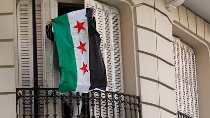 Un hombre sostiene la bandera rebelde siria en un balcón de la embajada de Siria en Madrid, este domingo. Foto: EFE/ Chema Moya | Vídeo: EPV