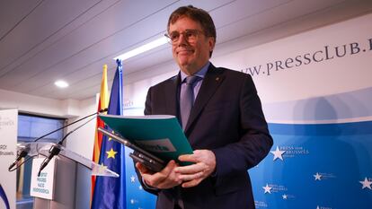 El presidente de Junts per Catalunya, Carles Puigdemont, ofrece una rueda de prensa tras una reunión de la junta directiva del partido en Bruselas, este lunes.Foto: OLIVIER HOSLET (EFE) | Vídeo: EPV