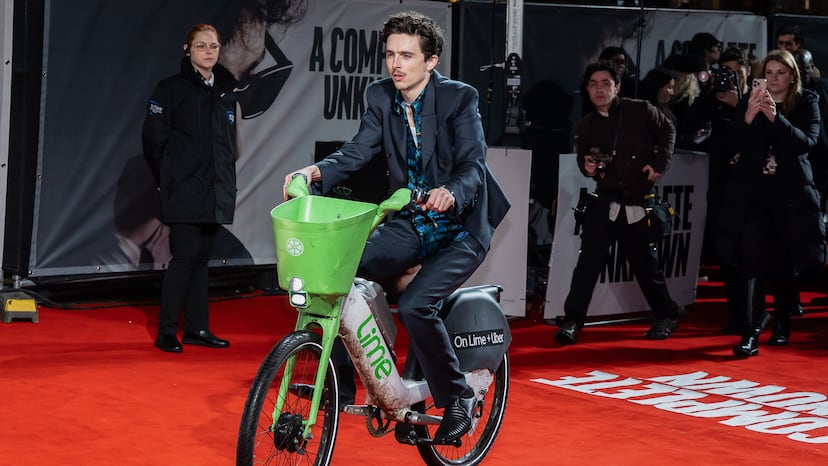 El actor Timothée Chalamet llega en bicicleta eléctrica de alquiler a la premiere de ‘Un completo desconocido’