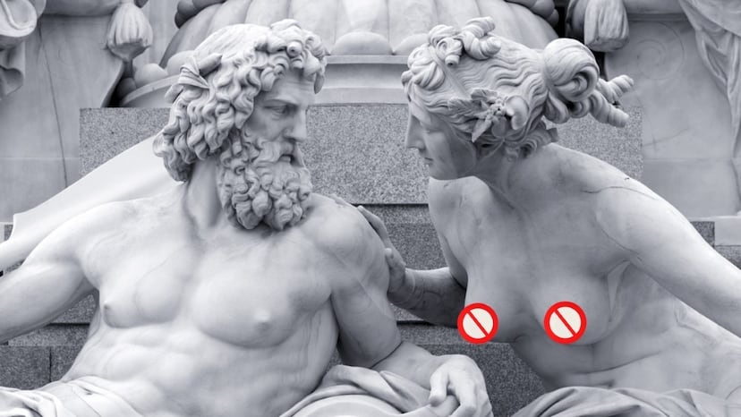Fotomontaje de una estatua con los pezones femeninos censurados.Foto: Getty / Collage: Pepa Ortiz | Vídeo: EPV
