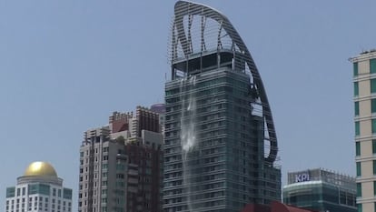 Terremoto de Myanmar: el agua de una piscina cae a la calle desde la azotea de un edificio en Bangkok
