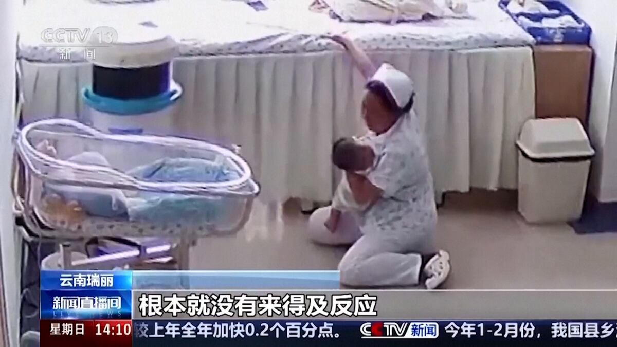 Dos enfermeras protegen a los recién nacidos en una maternidad china durante el terremoto de Myanmar