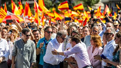 Feijóo, Almeida y Ayuso, entre otros líderes, se han concentrado junto a miles de manifestantes en la Plaza de España para pedir a Pedro Sánchez que adelante las elecciones
