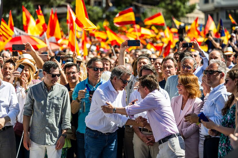 Feijóo, Almeida y Ayuso, entre otros líderes, se han concentrado junto a miles de manifestantes en la Plaza de España para pedir a Pedro Sánchez que adelante las elecciones