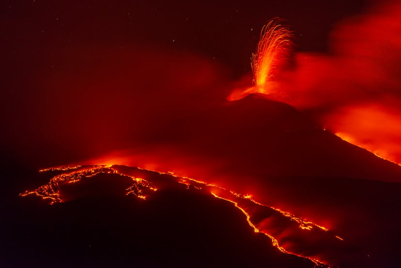 El volcán Etna deja ríos de lava tras su erupción, visto desde el aire