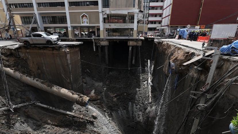 El momento en el que se hunde el suelo provocando un gigantesco socavón frente a un hospital en Bangkok