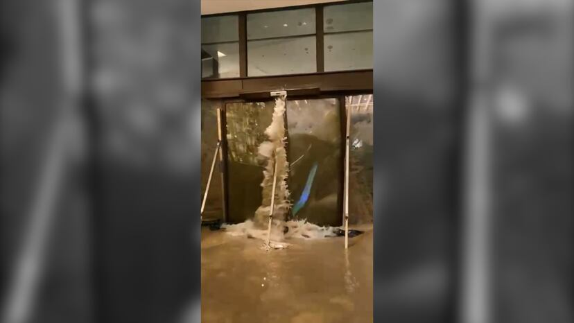 La fuerza del agua ha hecho estallar la puerta de entrada de un hotel y ha inundado la parte de la entrada, arrastrando a las personas y los objetos del interior