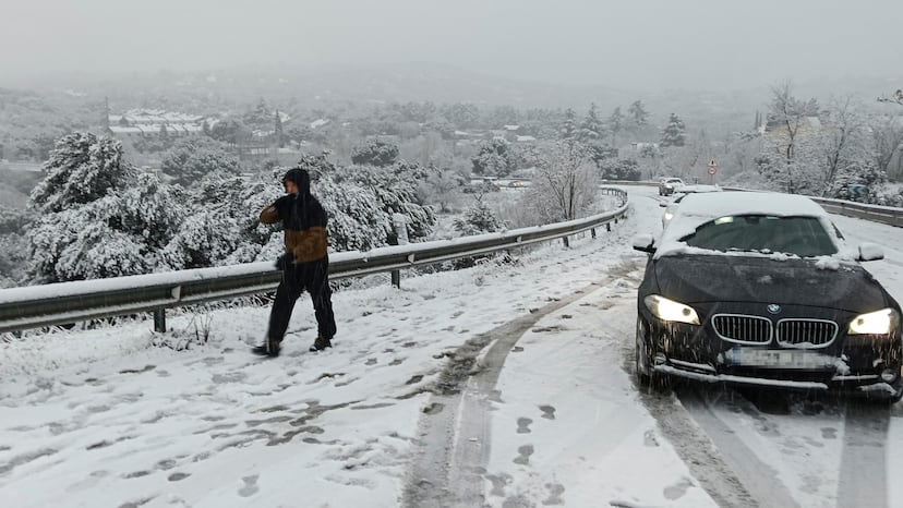 GALAPAGAR(MADRID), 28/01/2026.- Una persona camina junto a varios vehículos en la carretera M-519 a la altura de Galapagar, este miércoles. El temporal de frío, lluvia y nieve que atraviesa estos días la península mantiene afectados todos los puertos en la Comunidad Madrid por la nieve. Es necesario el uso de cadenas o neumáticos de invierno en todos los puertos de la Comunidad y en desde el kilómetro 13 de la A-6.Foto: EFE/Álvaro Blanco | Vídeo: EPV
