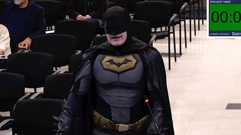 Un hombre disfrazado de Batman en el concejo municipal de California el 29 de enero de 2026. Foto: Foto a un vídeo de Reuters.