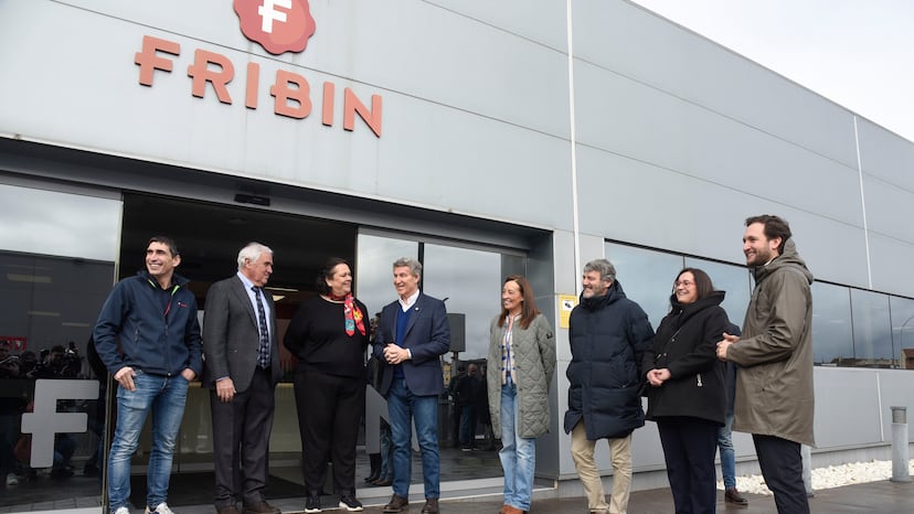BINÉFAR (HUESCA), 04/02/2026.- El presidente del PP, Alberto Núñez Feijóo (4i), durante su visita este miércoles a la empresa cárnica FRIBIN, en Binéfar (Huesca). Foto: EFE/ Javier Blasco | Vídeo: EPV
