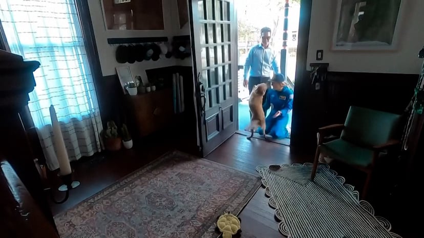 Sadie, la perra de la astronauta Christina Koch, la recibe tras su viaje espacial con la misión Artemis II.Vídeo: Redes sociales