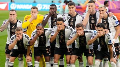 Los futbolistas de la selección de Alemania mostraron su descontento con la FIFA con una poderosa imagen en el posado inicial: con la mano cubriendo la boca. El organismo que rige el fútbol mundial vetó el brazalete one love, que pretendía concienciar sobre la situación de los derechos humanos en Catar, en particular del colectivo LGTBI+ y la Mannschaft ha contestado con ese gesto de equipo silenciado justo antes de enfrentarse a Japón en su debut, que acabó con derrota. “Una vez acabada la función de Infantino, ahora es el turno de los futbolistas”, ha señalado Ramon Besa, periodista de EL PAÍS, durante su intervención en el programa Fútbol Sapiens, de Universo Mundial.
